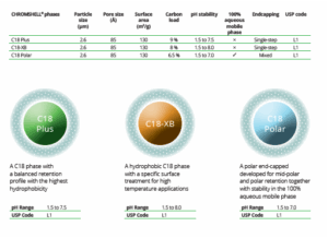 CHROMSHELL extends the ARION phases in the area of core-shell technology (SPP, Superficially Porous Particles). These columns use an ultra high purity silica of 2.6 μm particles.